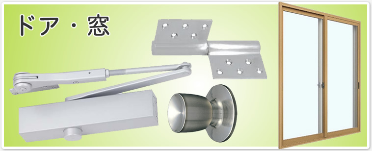 スチールドア(玄関、倉庫、車庫、事務所など) アルミドア(勝手口、物置、店舗など) ステンレスドア(ビルや店舗の出入口など) 玄関フード(風除室) アルミサッシ(窓) アルミフロント(ビルや店舗の出入口など) ドア金物 (ドアクローザー、フロアヒンジ、 戸車(窓などの下部に付いてるタイヤ) クレセント(窓のカギ) |